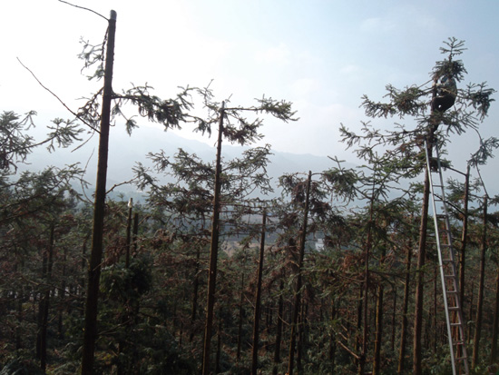 安福县武功山林场杉木、火炬松良种基地为了提高母树产种量,对7米以上采种困难的母树进行截顶试验,便于今后方便采种。